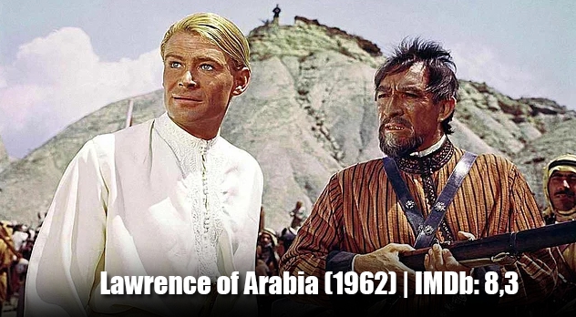 7 - Lawrence of Arabia (1962) | IMDb: 8,3David Lean filmografisinin en ünlü yapıtı olan film Arap İsyanı’nın başlamasında önemli bir rol oynayan İngiliz bilim adamı ve ordu casusu Thomas Edward Lawrence’ın Arabistan’daki görev sürecinde yaşananları konu alıyor. Kuzey Afrika’da genç bir teğmen olan Lawrence’ın bir teklif üzerine Arabistan’a gözlemci olarak gitmesi ve zamanla bölgede isyan çıkaran Araplara yardım etmesiyle artık, Arabistan topraklarına İngilizlerin de eli değmiş olur. Osmanlı Devleti’ne karşı kışkırtılan Arap halkı, İngilizlerle işbirliği içerisine girerek Osmanlı Devleti’yle çatışacağı bir savaşa sürüklenir. Yapım, dönemin tarihinde önemli yeri olan T.E. Lawrence’ın anılarından gazeteci Jackson Bentley’in araştırmalarıyla sinemaya aktarılmıştı. Yedi dalda Oscar ödülü kazanan film, savaşı konu alan her filmde olduğu gibi büyük tartışmalara sebep olmuştur.
