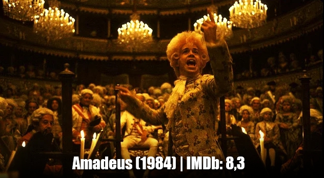 6 - Amadeus (1984) | IMDb: 8,3Dünya müzikal tarihine yön veren deha Mozart, gündelik yaşamında gerçek bir arıza karakter olarak yaşamdan bir hayli kopuk bir hayat tarzı sürdürmektedir. Yeteneğini dışa vurmak için ilginç bir yol seçen sanatçı tutarsız davranışlarda bulunmayı bir alışkanlık edinmiştir. Yaşamı ile müziği zıt kutuplarda ilerleyen Mozart, yeteneğini sergilemek için mantıksız hareketlerde bulunur. Adeta bir "tutunamayan" profili çizen Mozart, bu sağlıksız yaşamı yüzünden Antonio Salieri'yi endişelendirmektedir. Diğerine göre çok daha disiplinli ve müzik konusunda hırslı olan Antonio, müziğin tanrısı kadar başarılı olamamaktadır. Bu düşünceler zamanla farklı bir ilişki kurmalarına neden olur... Müzik konusunda yüce bir yeteneğe sahip olan Amadeus Mozart ile Antonio Salieri’nin ilişkisine odaklı bir başyapıt. Sanat ile sanatçının kişiliği arasındaki ilişkiye odaklanan ve usta müzisyenin yaşamını, Salieri üzerinden anlatan bir klasik.