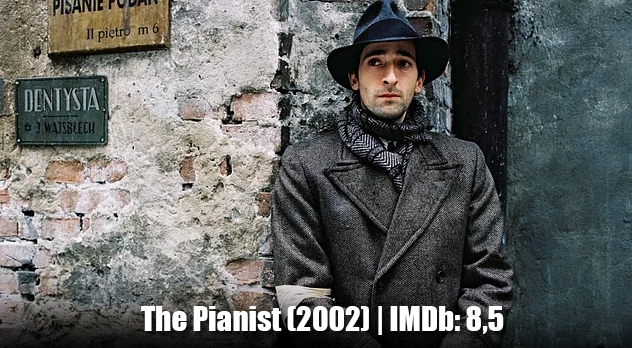 4 - The Pianist (2002) | IMDb: 8,5Roman Polanski’nin üç Oscar kazanan filmi İkinci Dünya Savaşı sırasında yaşanan gerçek bir dramı konu alır. Polonya’lı ünlü piyanist Wladyslaw Szpilman’ın anılarını anlattığı aynı isimli kitaptan sinemaya uyarlanan film, Nazi işgali altındaki Polonya’da yaşamanın imkansızlaştırıldığı bir dönemde, bir şekilde esir kampına gitmekten kurtulan ünlü piyanistin Varşova’nın kenar mahallelerindeki hayatta kalma mücadelesine odaklanır. Varoşlarda tam anlamıyla sefil bir hayat süren müzisyen, diğer halkla birlikte, kıtlığa ve aşağılanmalara maruz kalsa da kahramanca mücadele edecektir. Günü gelip oradan kaçma şansı bulduğundaysa başkentin harabelerine sığınacak, beklemediği bir anda gelen bir yardımla umudunu yeniden kazanacaktır.Film, En İyi Erkek Oyuncu dalında Oscar alan Adrien Brody'nin de filmografisinin en güçlü işlerinden biri.