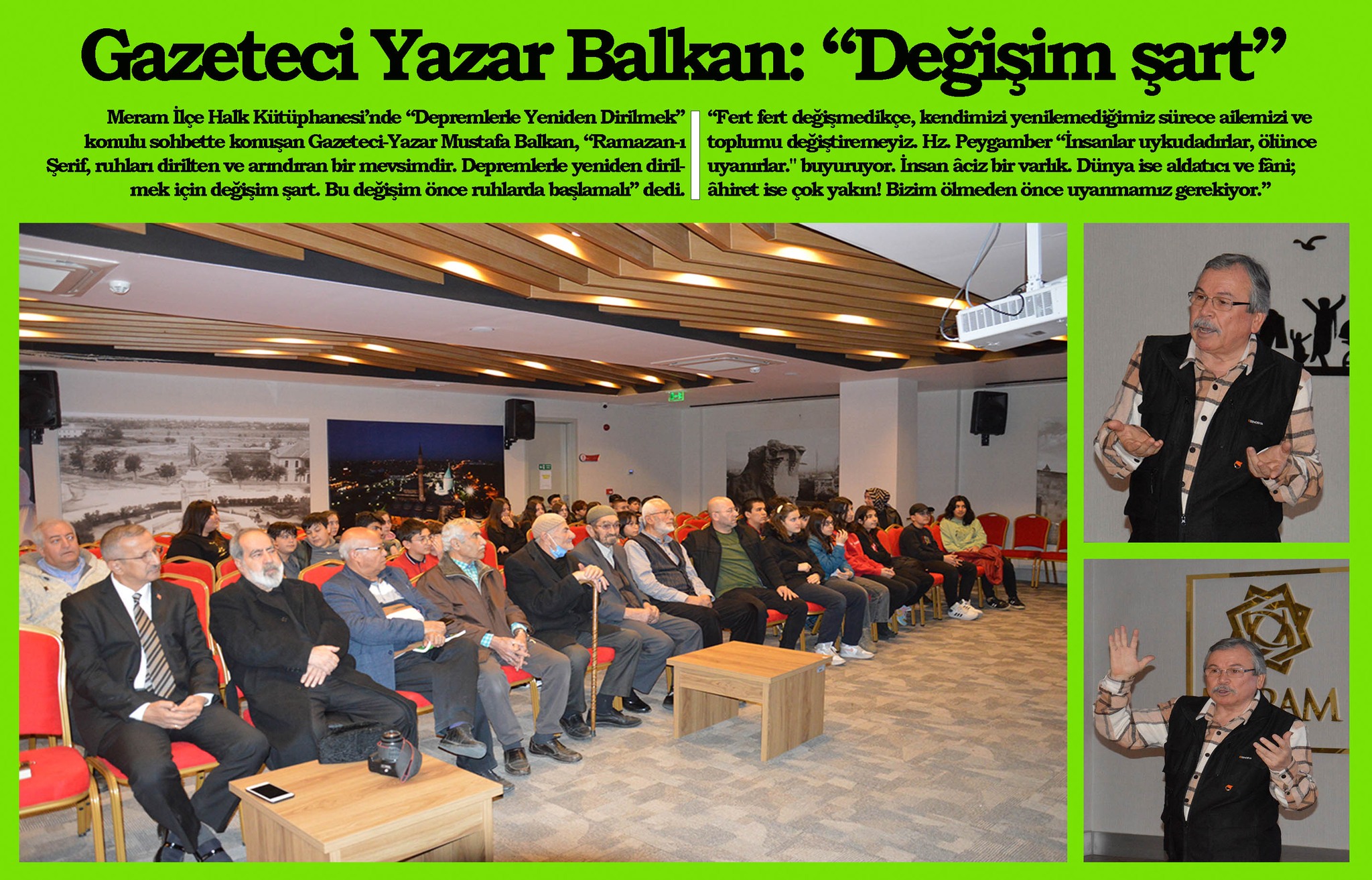 Meram İlçe Halk Kütüphanesi’nde “Depremlerle Yeniden Dirilmek” konulu sohbette konuşan Gazeteci-Yazar Mustafa Balkan, “Ramazan-ı Şerif, ruhları dirilten ve arındıran bir mevsimdir. Depremlerle yeniden dirilmek için değişim şart. Bu değişim önce ruhlarda başlamalı” dedi.