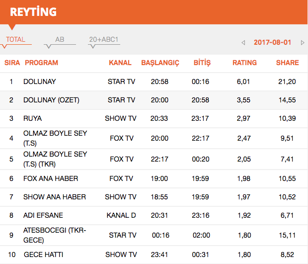 1 Ağustos 2017 Salı Reyting Sonuçları