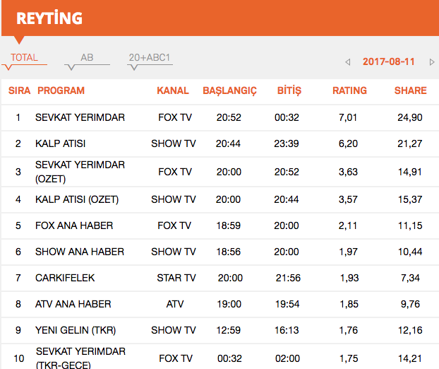 11 Ağustos 2017 Cuma günü reyting sonuçları açıklandı. Bu akşam yeni bölümüyle Fox Tv'de ekranlara Şevkat Yerimdar geldi peki Şevkat Yerimdar reyting sıralamasındaki yerini koruyabildi mi? Kalp Atışı dizisi bu hafta reyting sıralamasında yerini koruyabildi mi? 11 Ağustos Cuma reyting sırlamasında ilk 5 nasıl şekillendi?