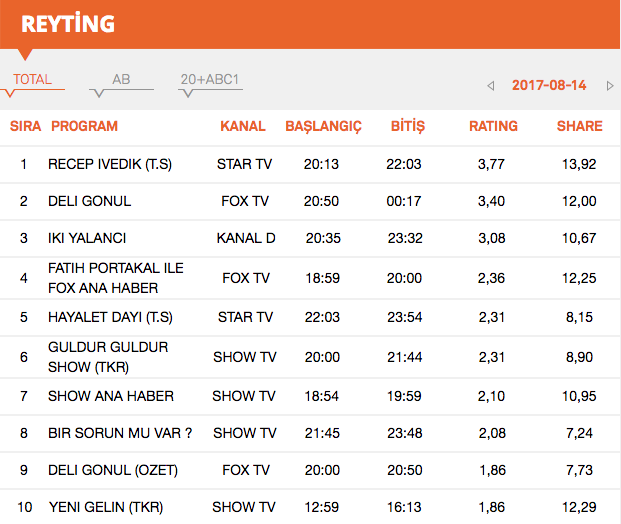 14 Ağustos 2017 Pazartesi reyting sonuçları