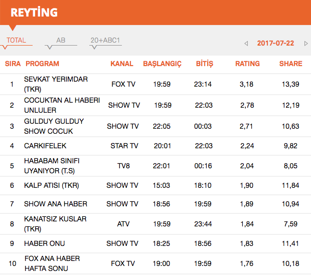 22 Temmuz 2017 Cumartesi Reyting Sonuçları