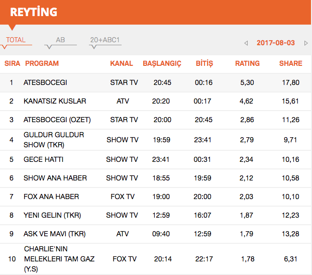 3 Ağustos 2017 - Ateşböceği reytingleri