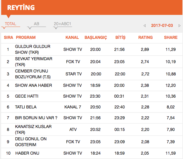 3 Temmuz Pazartesi 2017 Reyting Sonuçları