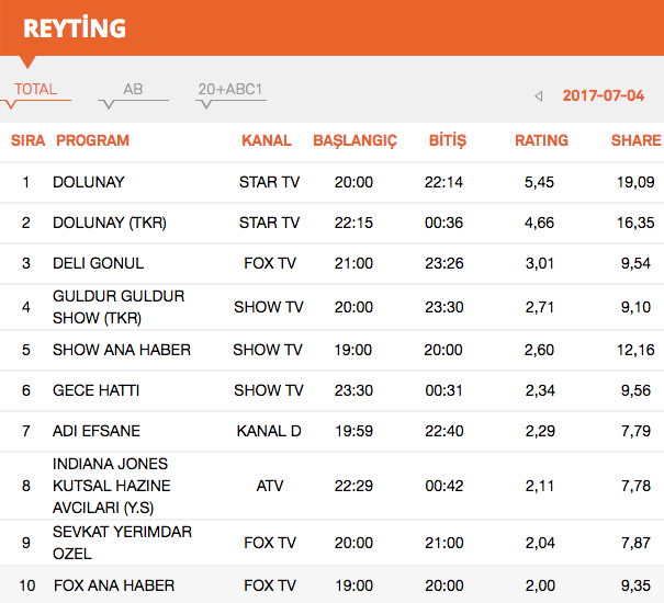 - Dün akşamın reyting sonuçları 5 Temmuz Çarşamba saat 12:00 gibi kesinleşmektedir. Her gün reyting sonuçları bir sonraki gün saat 11:00 - 12:00 arasında açıklanmaktadır. Açıklandığı an sitemizde yer alacaktır.
