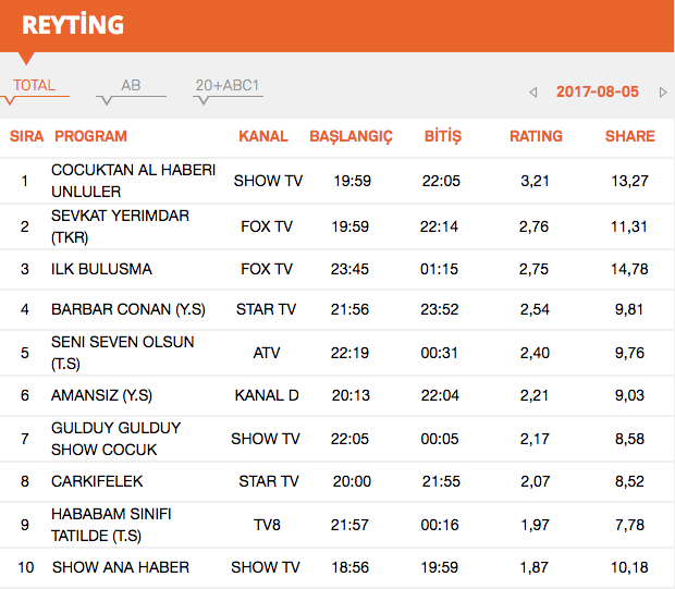 5 Ağustos 2017 Cumartesi reyting sonuçları