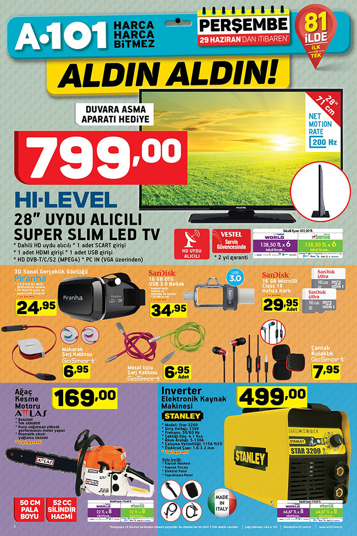A101 mağazalarında alışverişin indirimli ve kaliteli hali Ramazan Bayramı sonrasında da devam ediyor. A101 mağazalarında 29 Haziran Perşembe gününden itibaren geçerli aktüel ürünlerini sizlere hazırladık. Türkiyede 81 ilde ilk ve tek olarak yapılan kampanya 30 haziran, 1 Temmuz, 2 Temmuz şeklinde geçerli olacak A101 aktüel ürünlerine bakmaya hazrı mısınız? Keyifli alışverişler...