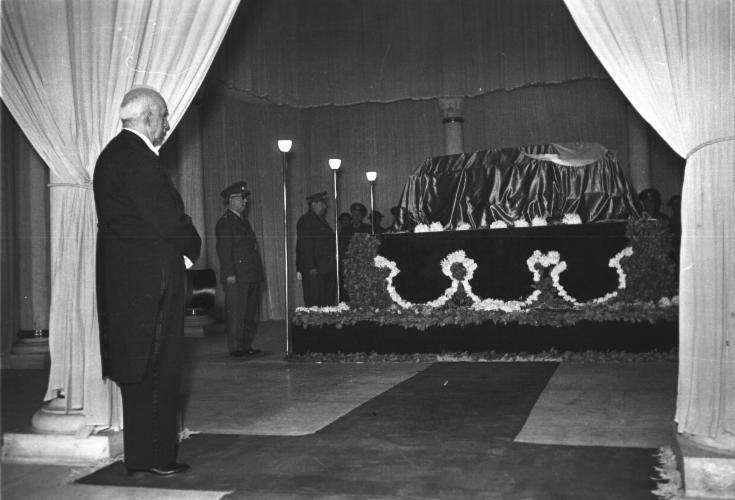 Mustafa Kemal Atatürk'ün 15 yıl boyunca Etnografya Müzesi'ndeki geçici kabirde kalan cenazesi 10 Kasım 1953 günü Anıtkabir'e nakledildi. Anadolu Ajansı, fotoğraf arşivinden derlenen karelerle Mustafa Kemal Atatürk'ün cenazesinin Etnografya Müzesi'nden Anıtkabir'e yolculuğunu anlattı. Atatürk'ün naaşı, Anıtkabir'e defnedilmek üzere Etnoğrafya Müzesi'nden çıkarılmadan önce CHP Genel Başkanı İsmet İnönü saygı duruşunda görülüyor. (Arşiv)