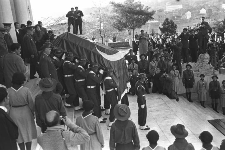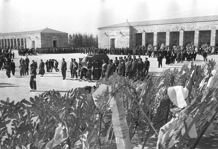 Mustafa Kemal Atatürk'ün 15 yıl boyunca Etnografya Müzesi'ndeki geçici kabirde kalan cenazesi 10 Kasım 1953 günü Anıtkabir'e nakledildi. Anadolu Ajansı, fotoğraf arşivinden derlenen karelerle Mustafa Kemal Atatürk'ün cenazesinin Etnografya Müzesi'nden Anıtkabir'e yolculuğunu anlattı. Atatürk'ün naaşı, Anıtkabir'e defnedilmek üzere Etnografya Müzesi'nden çıkarılırken Başbakan Adnan Menderes (sağda), CHP Genel Başkanı İsmet İnönü (sağ 3) de hazır bulunmuştu. (Arşiv)