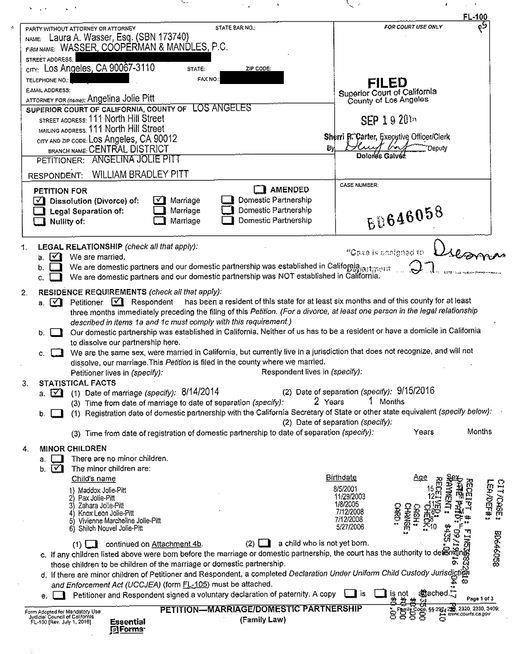 41 yaşındaki Angelina Jolie , boşanma sebebi olarak mahkemeye "şiddetli geçimsizlik" gerekçesi sunduğu öğrenildi.Jolie'nin avukatı Laura Wasser çocukları velayetinin müvekkilinde kalması istendi.