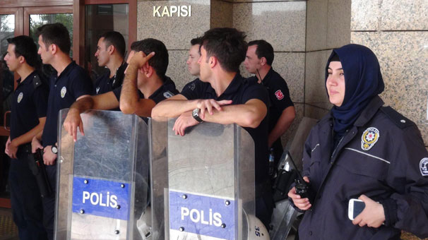İzmir'in Bayraklı Adliyesi'nde alınan güvenlik önemleri çerçevesinde, Emniyet Müdürlüğü Çevik Kuvvet Şube Müdürlüğü'nde görev adını gizli tutan başörtü kullanan kadın komiser, elinde bulunan telsiz ile adliyenin çevresinde dolanıp kendisine bağlı olan ekipleri yönlendirildiği belirtildi.