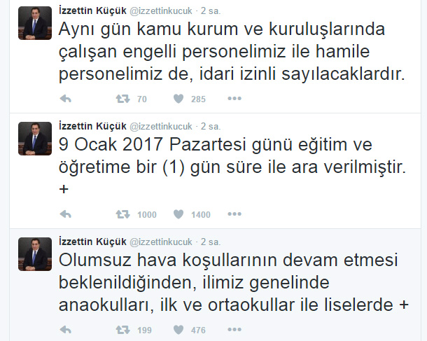 Bursa Valisi İzzettin Küçük Twetter Hesabında Bursa'da 9 Ocak pazartesi günü okullara olumsu hava koşulları ve yoğun kar yağışı sebebiyle 1 gün ara verildiğini açıkladı!