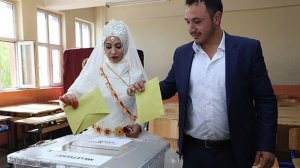 Gelin Şenol, AA muhabirine yaptığı açıklamada, düğününün böyle bir tarihe geldiği için çok mutlu olduğunu belirterek, "Düğünümüz bugüne denk geldi. Oyumuzu kullandık, buradan salona düğüne gidiyoruz. Gelinliğimle oy kullandım, mutluyum" dedi.