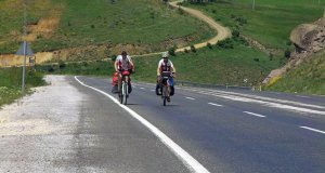 Bisikletleriyle İsviçre’den yola çıkan 2 kafadar turistin yolculukları devam ediyor. Yaklaşık 2 ay önce İsviçre’den yola çıkan ve yaklaşık 4 bin kilometre yol kat eden maceracı Hans Peter ile Slelav Hursak, dünya turu kapsamında yolculuklarına devam ediyor. Yunanistan ve Bulgaristan üzerinden Türkiye’ye giriş yapan turistler, sırasıyla İstanbul, İzmit, Yalova, Ankara, Kapadokya, Sivas, Erzincan, Erzurum, Ağrı, Artvin üzerinden Tiflis, buradan da Azerbaycan’a geçecekler. Turistlerin yolculukları ise Azerbaycan’ın Bakü kentinde bitecek. Yaklaşık 2 ay önce ülkelerinden yola çıktıklarını ve yolculuklarını Bakü’de bitireceklerini ifade eden turistler, ziyaretleri sırasında Türkiye’nin güzelliklerini de gördüklerini söylediler. Türkiye’yi sevdiklerini belirten turistler, çok güzel bir coğrafyada yer aldığını ifade ettiler.