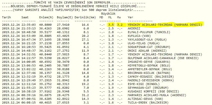 KANDİLLİ RASATHANESİ SON DEPREMLER LİSTESİ VERİLERİ