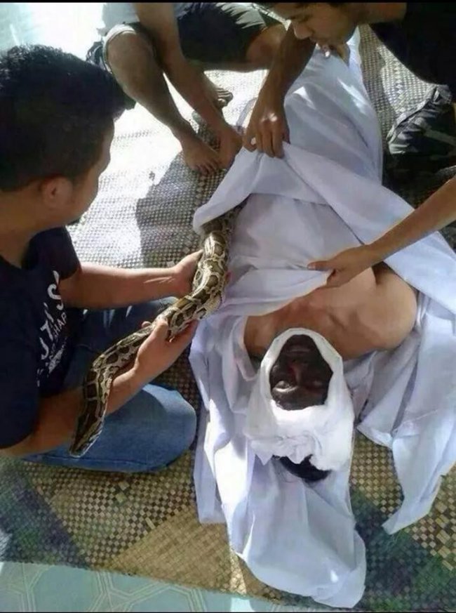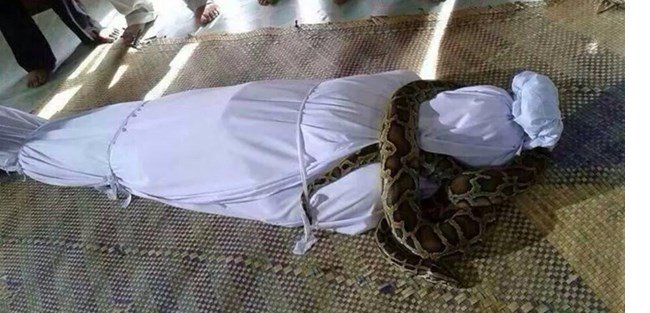 Sosyal medyada paylaşılan fotoğraf kareleri insanın tüylerini diken diken ediyor. Nerede çekildiği bilinmeyen fotoğraflarda, kocaman bir yılan, bir naaşın etrafını sarmış vaziyette görünüyor.