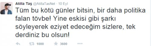 Sanat piyasasından silindikten sonra sosyal medyada yaptığı siyasi paylaşımlar ile 'sol krıması' sözde aydınlara 'şirinlik gösterisi' yapan ve Gezi çapulcularına verdiği destek ile bilinen Atilla Taş, önemli bir karar alarak pes ettiğini açıkladı. AK Partihükümetine ve Cumhurbaşkanı Recep Tayyip Erdoğan'a karşı türlü türlü iftira atan ve karalama kampanyası yürüterek birçok kez tepki çeken Taş, yaptığı son paylaşım ile artık politika konularına gimryeceği müjdesini verdi. Daldan dala atlayan Atilla Taş'ın sanattan sonra siyasete, siyasetten de şimdi hangi dala atlayacağı ise merak konusu oldu.