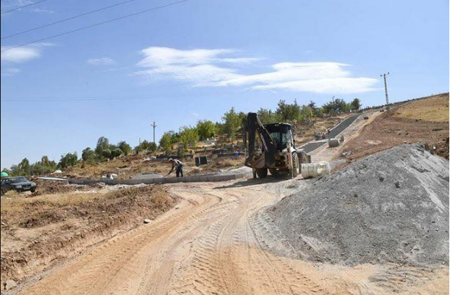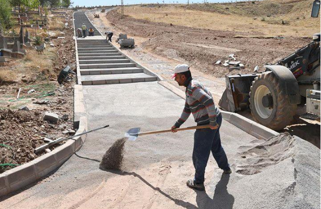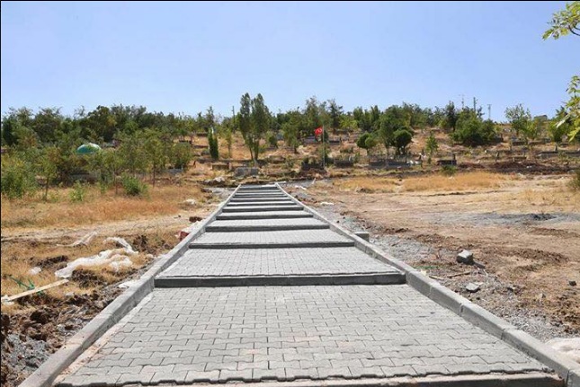 Mezarlık alanındaki patika yollar parke taşı ile döşenirken, vatandaşların oturabileceği bank ve kamelyalar da kuruluyor. Öte yandan patika yolların kenarlarına su giderleri yapılırken, mezarlık alanında kapsamlı bir yeşillendirme yapılıyor.