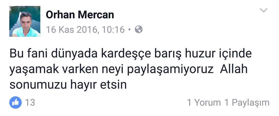 Orhan Mercan Sosyal medya hesbından " Bu fani dünyada kardeşçe barış huzur içinde yaşamak varken neyi paylaşamıyoruz Allah sonumuzu hayreylesin" mesajı yayınlamıştı