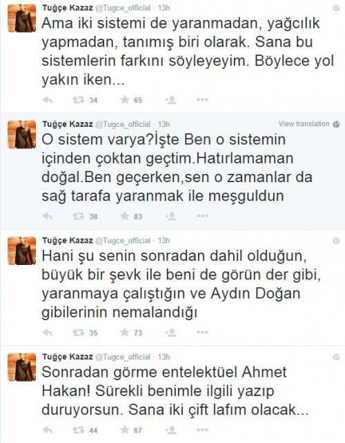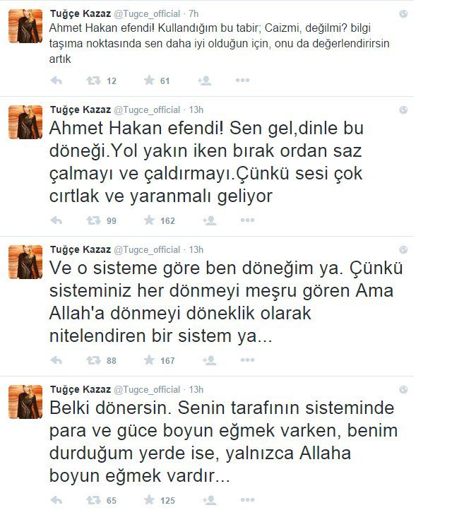 Son dönemdeki politik söylemleriyle dikkat çeken model Tuğçe Kazaz, Twitter hesabından “Ahmet Hakan efendi! Sen gel,dinle bu döneği.Yol yakın iken bırak ordan saz çalmayı ve çaldırmayı. Çünkü sesi çok cırtlak ve yaranmalı geliyor”diye yazdı.