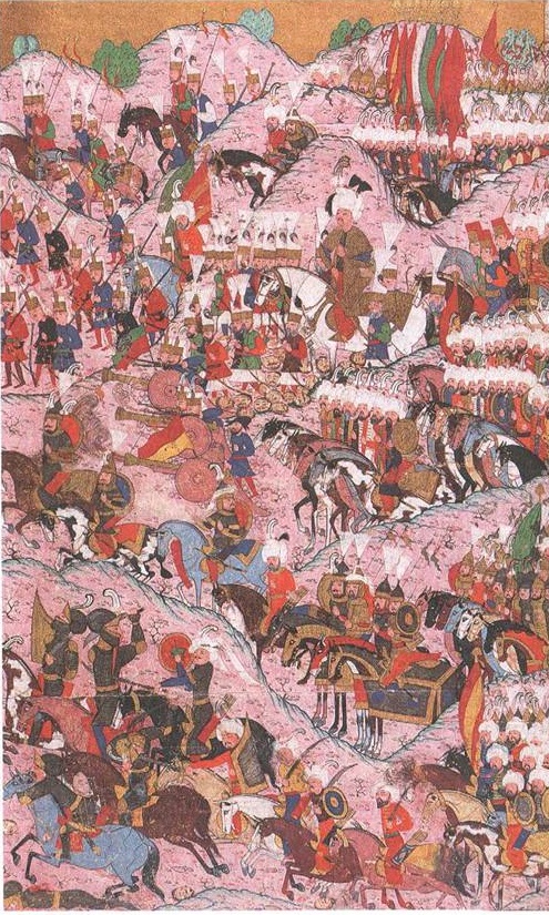 Buradaki resimde Kanuni Sultan Süleyman’ın Mohaç Seferine gitmesi. Görüldüğü üzere sultanın önünde toplar ve Yeniçerilerin omuzlarındaki tüfekler hemen dikkat çekmektedir.