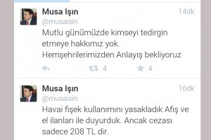 " Yasağı afiş ve el ilanları ile duyurduk. Ancak cezası 208 TL dir. Mutlu günümüzde kimseyi tedirgin etmeye hakkımız yok. Hemşerilerimizden anlayış bekliyoruz. " ( Ömer Adıgüzel - İLKHA)